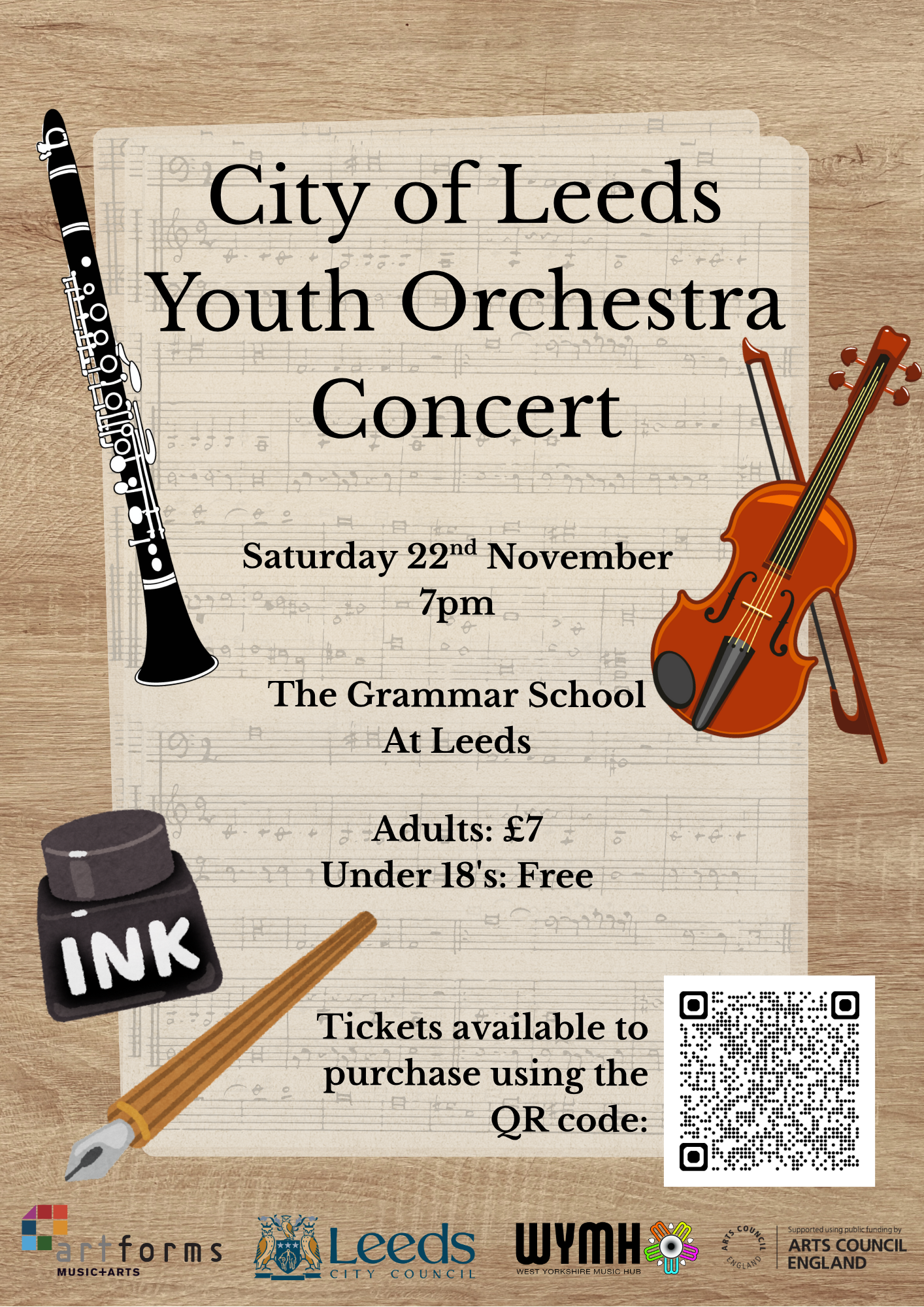 £7 adult (including booking fee). U18s free Click here to purchase your tickets https://www.ticketsource.co.uk/artforms-music-service/city-of-leeds-youth-orchestra-concert/2025-11-22/19:00/t-vxevojp